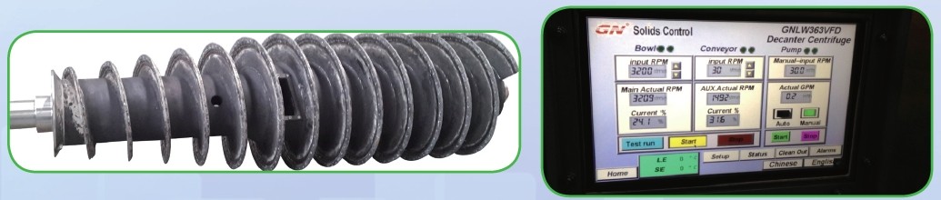 GNLW系列泥漿離心機(jī)( Decanter Centrifuge) 又稱(chēng)臥式螺旋卸料沉降離心機(jī)、泥漿離心機(jī),是針對(duì)石油鉆井液的特點(diǎn),設(shè)計(jì)的固液分離專(zhuān)用設(shè)備,可在全速運(yùn)轉(zhuǎn)下完成進(jìn)料、離心沉降、卸料等各道工序,主要用于回收重晶石,清除細(xì)小固體,降低鉆井液的固體含量,控制鉆井液的密度、粘度,保證鉆井液的性能以及對(duì)快速鉆井均有重要作用。GNLW系列離心機(jī)是利用離心沉降原理對(duì)鉆井懸浮液進(jìn)行分離,懸浮液由進(jìn)料管經(jīng)螺旋推料器中出液孔進(jìn)入轉(zhuǎn)鼓,在離心力 的作用下固相顆粒被推向轉(zhuǎn)鼓內(nèi)壁,通過(guò)螺旋推料器上的葉片推至轉(zhuǎn)鼓小端排渣口排出,液相則通過(guò)轉(zhuǎn)鼓大端的溢流孔溢出。如此不斷循環(huán),以達(dá)到連續(xù)分離的目的。沉降型離心機(jī)屬于臥式螺旋離心機(jī)范疇,全稱(chēng)臥式螺旋沉降型離心機(jī)。冠能固控生產(chǎn)的臥式沉降型泥漿離心機(jī)廣泛應(yīng)用于石油鉆井行業(yè)。
