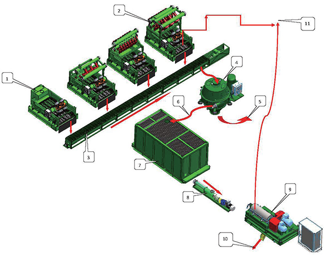 鉆井泥漿不落地處理工作流程說明如下:鉆機過來的泥漿通過高架管匯進入振動篩(1)、清潔器(2),經(jīng)過(1)、(2) 處理排放的鉆屑通過螺旋輸送器(3)輸送至立式甩干機處理(4)。立式甩干機處理完的固體通過廢渣(5) 排除,回收到的鉆井泥漿(6)進入鉆井液泥漿罐體(7),離心機供液泵或螺桿泵(8)抽取含有細固 顆粒的回收泥漿,供給離心機(9 )處理,固體部分通過固體排渣口(10)排除,處理完成的鉆井液通 過干凈泥漿回歸泥漿系統(tǒng)(11)。