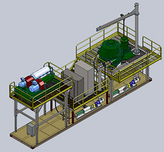 工作時候,將鉆屑甩干機支架升高到最高處,能夠滿足鉆屑甩干機的鉆屑排放。離心機放于翹座的罐體上, 排出的液相部分直接流入到底部的收集罐中,需要輸送鉆井液時候,可以通過一臺輸送泵進行輸送或?qū)?此罐體與相近高度的罐體進行連接。