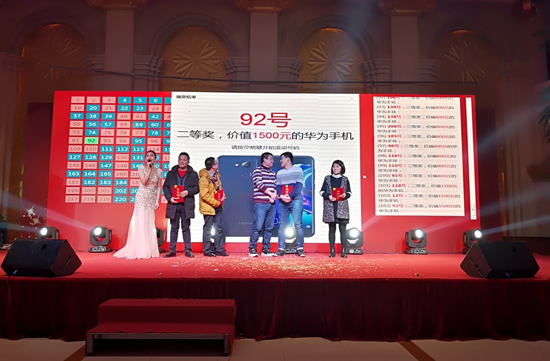在總經(jīng)理的帶領(lǐng)下,冠能公司很多同事成了“花粉”,也就是華為的粉絲。2017年年會主題,就是借用的華為公司任總的話“不破樓蘭終不還”。我們也一直弘揚(yáng)類似華為的奮斗者文化,讓跟隨公司共同奮斗發(fā)展的員工,有一個獲得認(rèn)可的回報。奮斗者不一定成功,但成功者必定奮斗過,我們將繼續(xù)努力奮斗。在這幾年年會里,用于抽獎的獎品大部分都是華為產(chǎn)品。今年特等獎是5臺彩色電視機(jī),一等獎是10臺華為PAD,二等獎是20臺華為手機(jī),三等獎是40臺華為手環(huán),四等獎是60臺美的電火鍋。共計獎品135臺。在此,再次恭喜得獎的幸運(yùn)朋友。