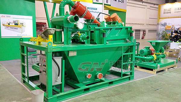 本次展會主要展出了120m³/h處理量的泥漿回收系統(tǒng)及配套的射流混漿系統(tǒng),主要配置了一臺GNZY753E-Y1S型篩泥一體機,雙層篩網(wǎng)設(shè)計,面積達到2.225m³,可分離固相粒度40微米,旋流器采用高質(zhì)量聚氨酯材質(zhì),耐磨,使用壽命長,振動電機采用國際意大利OLI品牌或者美國馬丁品牌,篩箱底框采用不銹鋼材質(zhì),振動強度達到7.1G(可調(diào)),并配有GNSB6×5A(37KW)離心泵為除泥供漿泵,采用機械密封,使用壽命長并便于維修。整套系統(tǒng)撬裝設(shè)計,移動便捷,使用方便。