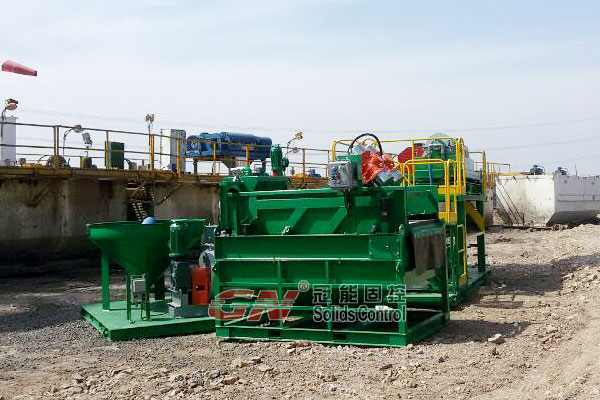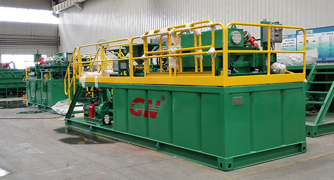 本套系統(tǒng)分為2個階段的固控處理和一套泥漿配置混合系統(tǒng)。鉆井泥漿初步分離采用的是冠能GNZS752型振動篩,200GPM的處理能力、兩片篩網(wǎng)的構(gòu)造用來處理鉆井泥漿中的大顆粒的固體。振動篩處理后的液體通過離心泵輸送給迷你型的沉降離心機GNLW223進(jìn)一步處理,可達(dá)3800RPM的轉(zhuǎn)速,分離的固體顆粒可達(dá)到2個微米。